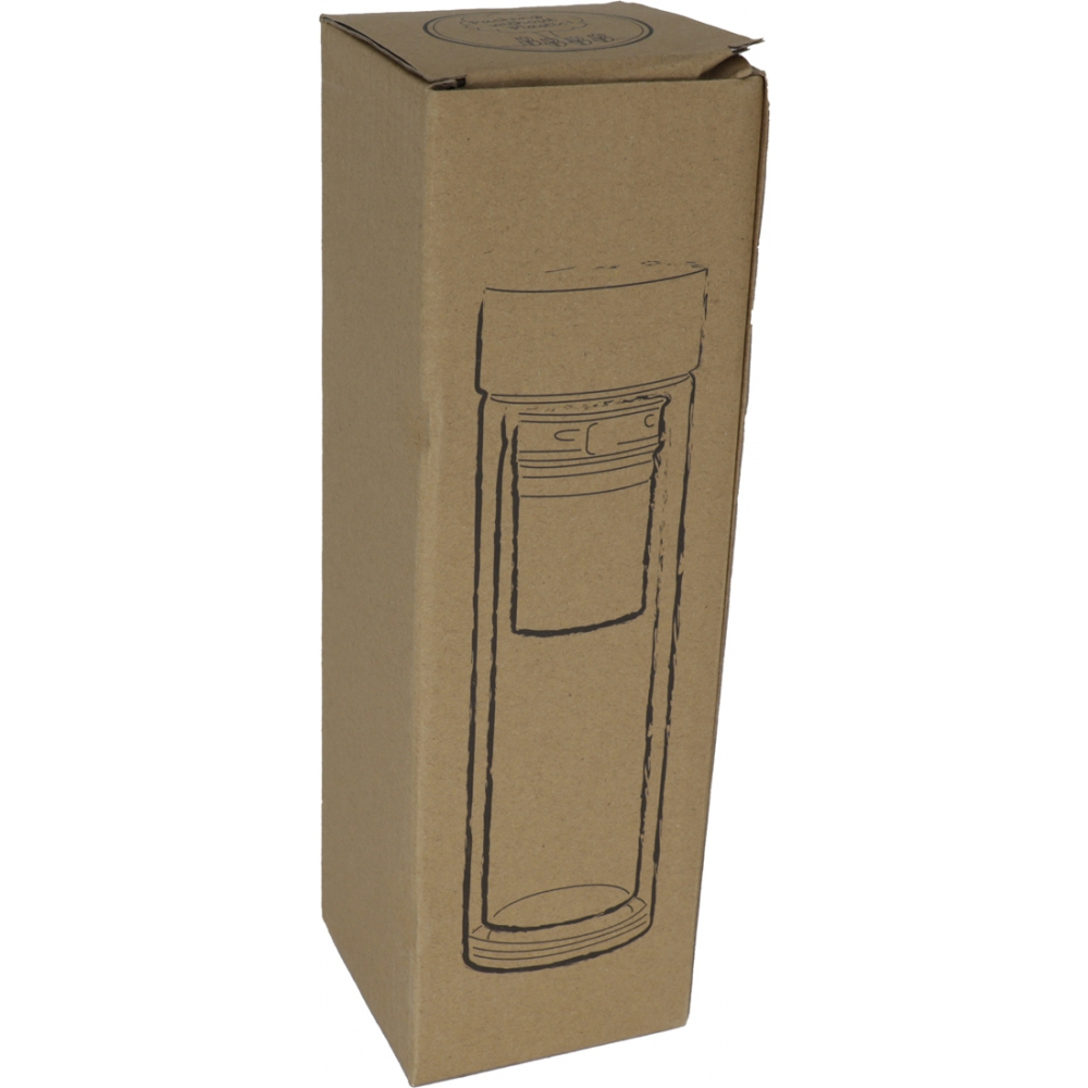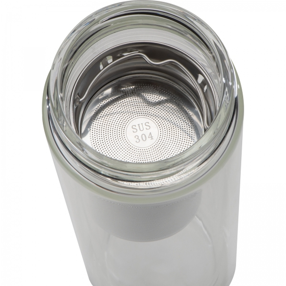 Szklana butelka o pojemności 420ml z podwójnymi ściankami. Posiada bambusową zakrętkę oraz sitko do herbaty lub owoców.