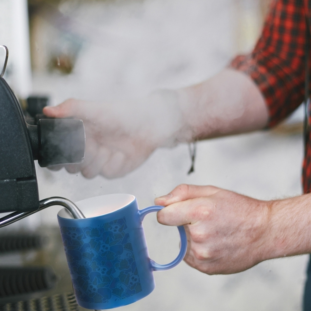 Efektowny kubek do sublimacji - kiedy jest zimny nie widać nadruku, ale po wypełnieniu ciepłym napojem reklama staje się widoczna.