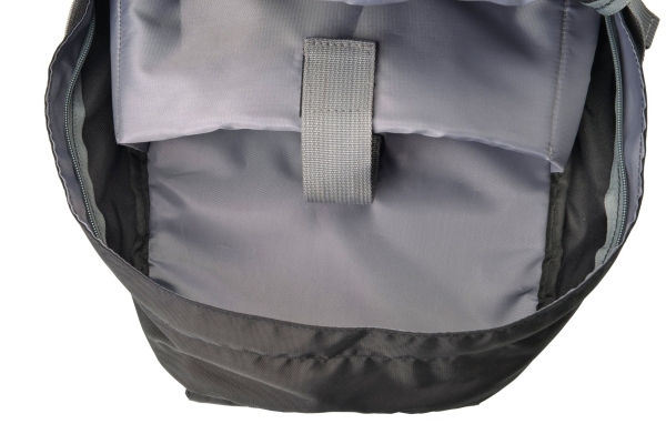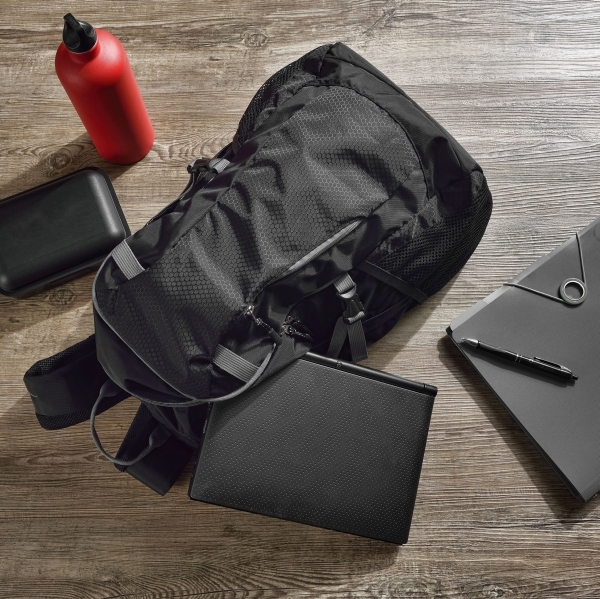 Praktyczny plecak odpowiedni podczas podróżowania jak i codziennego użytkowania. Watowany system pleców, szelki z uchwytami, praktyczna kieszeń z zabezpieczeniem na laptop, dwie kieszenie na butelki, taśmy kompresyjne, kieszeń wewnętrzna z przedziałką na drobiazgi oraz karabińczyk, kieszeń na buty. Materiał: 300D nylon, dobby nylon, 210D poliester. Pojemność: 27 l.