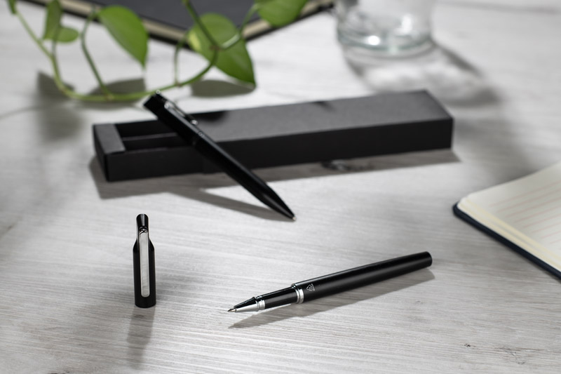 Zestaw piśmienniczy EFAN to stylowy komplet składający się z długopisu oraz pióra kulkowego, wykonanych z recyklingowanego aluminium. Oba elementy mają smukłą, czarną konstrukcję z matowym wykończeniem i subtelnymi srebrnymi detalami. Długopis wyposażony jest w niebieski wkład, a pióro kulkowe w czarny, oba o grubości pisania 1,0 mm i długości do 500 metrów. Całość zapakowana w czarne kraftowe pudełko papierowe.